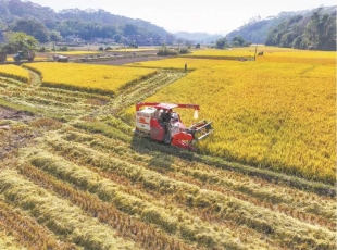 2024-11-14联合收割机在田里收割水稻。 颗粒归仓。 眼下正是晚稻丰收季。我市119.95万亩晚稻陆续进入收割期,农户们正抢抓晴好天气收割晾晒,确保粮食颗粒归仓,田间地头一派繁忙景象。 11月7...