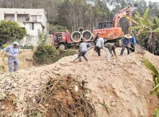 2024-11-11群众在修建农耕便道。 “修了这条农耕便道后,现代化的农业机器可以直达田里进行耕作收割了,彻底改变了这片农田几十年来只能靠人工耕作收割的历史,我们总算盼来这天了。”近日,灵山县太平镇六谭村老党...