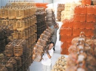 2025-09-28搬运鸟笼,批量出库。 工作人员在整理鸟笼半成品。 梁海洋(左)和手艺人在编织鸟笼。 昨日上午9时,阳光洒在柳江区百朋镇新圩场的鸟笼制作基地。千百个成品鸟笼错落有致地陈列着,大小不...