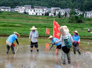 2024-07-08近日,南丹县农业农村局党总支部到巴平万亩梯田开展“农业强国”稻田画制作主题党日活动。 各小组按照设计图纸查找坐标,定位、插杆定桩勾勒稻田画的轮廓。 图为当地群众插秧现场 活动中,...