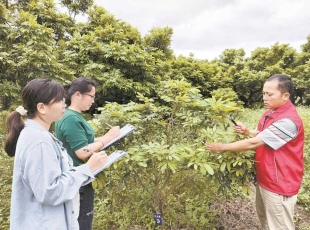 2024-05-20平山镇农技人员了解龙眼树的抽梢情况。周顺彬 谢窍霞 摄 4月25日,灵山县平山镇龙眼产业示范村山秀村“丈古田”(地名)桥完成桥墩基桩施工,这标志着该镇为龙眼核心产区建桥的计划,取得了实质...
