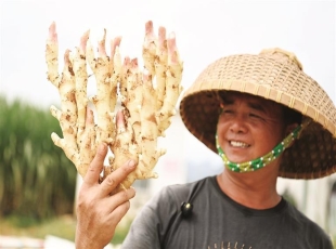 2025-09-15村民展示新鲜的“大块姜”。 村民在地里整理刚采收的生姜。 货车直达地头,生姜现挖现发。近日,位于柳南区洛满镇洛河村群乐屯成片的绿油油的姜田里,村民排成一列,整理刚从地里挖出来的新鲜...