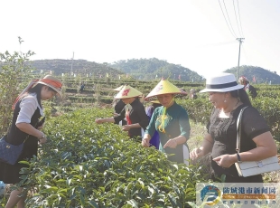 2024-12-16图为游客体验茶叶采摘。防城港日报全媒体记者 韦英奇 摄 11月20日上午,与迪拜的客户在云端相商;下午,又赶赴东兴,与印尼的外商面谈;晚上,克服时差影响,与新西兰的茶商进行视频会谈……一片“树叶...