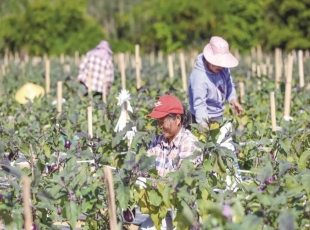 2024-12-09工人在田间管护紫冠圆茄。 “这里原来主要种植夜香花,冬天夜香花要休眠,为了把闲置的土地盘活起来,提高利用率,我们种了40多亩紫冠圆茄、西葫芦和南瓜。目前茄子已经开始上市,采摘之后主要销往南宁...