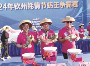 2024-12-09蚝王争霸赛,冠军亚军季军蚝王合影。融媒体记者 梁 生 摄 碳烤生蚝汁水充盈味道鲜美。 冬日暖阳,肥蚝蟹鲜。11月30日,在沙井岛蚝情广场,渔歌阵阵、热闹非凡,由市委、市人民政府主办的2...