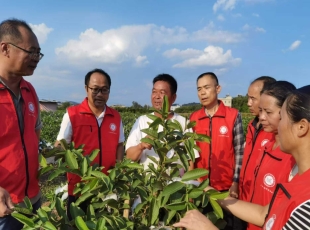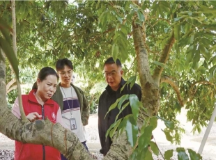 2024-12-09科技特派员向种植户介绍荔枝控稍技术。 “当前荔枝各品种的末次秋梢已经基本老熟,秋梢充分老熟的果园可采取乙烯利加多效唑加微量元素叶面肥等药物或环割措施进行控梢……”近日,身穿红马甲的广西科技特...