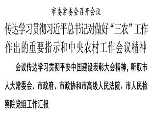 2022-03-034日,市委常委会召开会议,传达学习贯彻习近平总书记对做好“三农”工作作出的重要指示和中央农村工作会议精神,传达学习贯彻平安中国建设表彰大会精神,听取市人大常委会、市政府、市政协和市高级...