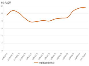 2024-11-08截至2024年11月4日,砂糖橘销地批发价格报11.48元/公斤,较前一周上涨0.65元/公斤,涨幅6%;较上月同期(2024年10月21日)上涨0.91元/公斤,涨幅8.61%。 新华...