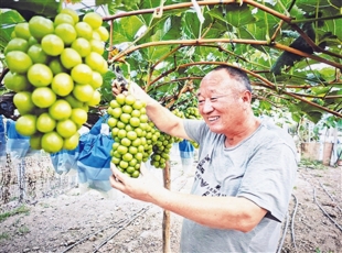 2024-09-09王峰在采摘阳光玫瑰葡萄 绿蔓繁茂处,葡萄飘香时。9月7日,秦都区夏家寨村阳光玫瑰葡萄采摘园里,56岁的种植户王峰与采摘工人小心翼翼地采摘着成熟的葡萄,脸上洋溢着丰收的喜悦。 “这几天采...