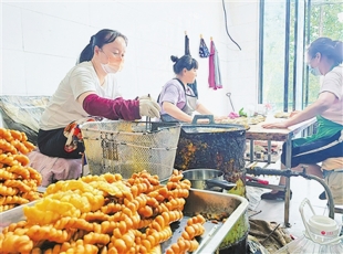 2024-07-23农户在制作麻花 7月17日,大雨过后,空气清新。武功县大庄镇北韩村村民赵密峰,一大早就出了门,到村西头的甜甜麻花店,开始了一天的工作——搓麻花。 一张长案,一口油锅,3名工人组成一条“...