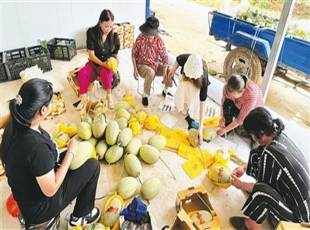 2024-07-15杨敏(左二)和务工的留守妇女一起包装刚采摘的哈密瓜。 “欢迎大家来我的直播间,我们的哈密瓜今天开园上市,欢迎大家来豆灰村免费品尝。”7月12日,在永寿县常宁镇豆灰村哈密瓜大棚种植基地,“...