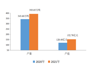 2022-03-142020-2021年全省饲料工业产量产值对比图 根据农业农村部“中国饲料工业统计信息系统”数据显示,2021年陕西省工业饲料总产量393.05万吨,总产值152.70亿元,同比分别增长1...