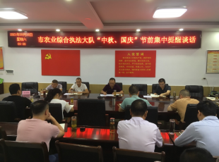2021-10-19按照党风廉政建设宣教月活动部署安排,9月18日上午,市农业综合执法大队组织全体党员干部,举办了党纪法规专题教育活动。 会上,宣读了荆州市纪委发出的关于中秋国庆两节严明的10项纪律,学习了松滋...