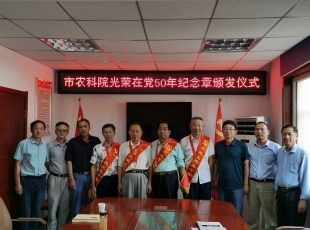 2021-09-16市农科院举行“光荣在党50年”纪念章颁发仪式,为具有50年以上党龄的老党员老干部代表颁发纪念章。支部书记、副书记、支委委员、老党员代表出席颁发仪式。 颁发...
