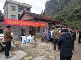 2022-02-262月23日,河池市农业科学研究所蚕桑产业科技先锋队组织技术骨干5人到宜州区安马乡木塘屯开展科技示范点物资发放和桑园“抗低温、防冰冻、促春耕”技术培训活动。 活动中科技人员就当前长期低温多雨的...