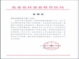 2021-12-27近日,省农业农村厅收到农业农村部畜牧兽医局发来表扬信和感谢信。 一是对2020-2021年度畜牧业统计监测工作表现突出的省畜牧技术推广总站林苓、澄迈县畜牧兽医局王明才等2名同志予以通报表扬;二是...