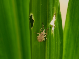 2024-06-18大灰象甲又称象鼻虫,属鞘翅目象甲科,是一种杂食性害虫,其以成虫咬食植株子叶、幼苗和心叶,形成孔洞或缺刻,破坏植株生长点,严重时直接将叶片或嫩茎咬断。 发生规律: 2年1代,第一年以幼虫越冬,第...