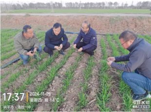 2024-12-16察看兴平市不同时期灌水对比试验小麦苗情 小麦宽幅沟播播期播量试验 为不断深化小麦宽幅沟播集成技术研究,增强大面积单产提升技术支撑。11月28-29日,省农技站王宏军副站长带队,先后对咸...