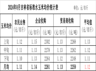 2024-09-12一、省内玉米市场形势 8月,我省玉米价格下降,玉米市场运行偏弱。 标准水玉米旬均价和月均价如下: (一)加工企业收购价格下调 8月,我省加工企业收购积极性下降,多数加工企业下调玉米收购...
