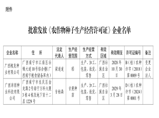 2024-04-22依据《中华人民共和国种子法》《农作物种子生产经营许可管理办法》等有关规定,批准发放广西粮发种业有限公司和广西沛雨种业科技有限公司《农作物种子生产经营许可证》(详见附件),现予公告。 附件:批...