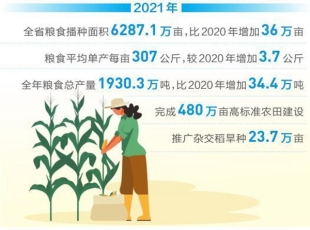 2022-03-142021年,全省粮食播种面积6287.1万亩,比2020年增加36万亩,增长0.58%;粮食平均单产每亩307公斤,较2020年增加3.7公斤,增长1.2%;全年粮食总产量1930.3万吨,比...