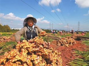 2022-05-20罗平小黄姜 通讯员 李景 摄 曲靖市罗平县是中国知名生姜生产区和世界优质小黄姜核心产区。近日,在罗平小黄姜国际交易市场内,卡车师傅卢先生刚刚完成装货,准备将一车小黄姜干片运往安徽。每年的11...