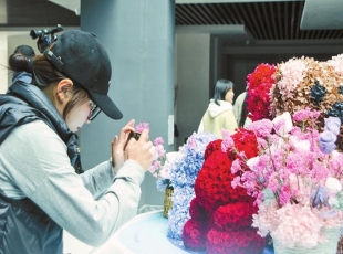 2022-03-21观展人员在永生花展品前拍照 永生花,也叫生态花,是将鲜切花经过脱水、脱色、烘干、染色等一系列工序加工而成。和普通干花不一样,无论是色泽、形状、手感几乎与鲜切花无异,是花艺设计、居家装饰、庆典...