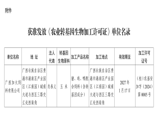 2024-04-08广西加大饲料有限公司于2023年12月13日向我厅申请办理《农业转基因生物加工许可证》。依据《农业转基因生物安全管理条例》和《农业转基因生物加工审批办法》有关规定,我厅对上述企业申请农业转基因...