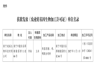 2024-04-08南宁通威生物科技有限公司于2023年11月27日向我厅申请办理《农业转基因生物加工许可证》。依据《农业转基因生物安全管理条例》和《农业转基因生物加工审批办法》有关规定,我厅对上述企业申请农业转...