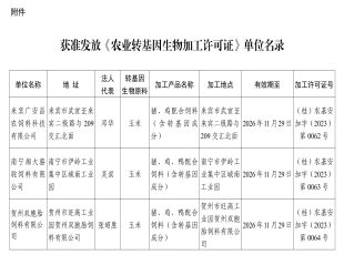 2024-04-08来宾广安昌农饲料科技有限公司、南宁湘大骆驼饲料有限公司与贺州双胞胎饲料有限公司分别于2023年11月2日、11月7日与11月8日向我厅申请办理《农业转基因生物加工许可证》。依据《农业转基因生物...