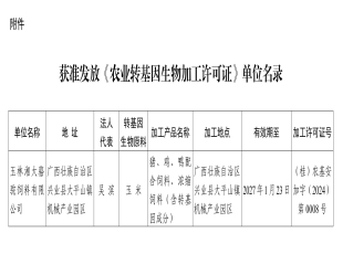 2024-04-08玉林湘大骆驼饲料有限公司于2023年12月21日向我厅申请办理《农业转基因生物加工许可证》。依据《农业转基因生物安全管理条例》和《农业转基因生物加工审批办法》有关规定,我厅对上述企业申请农业转...