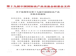 2021-11-04鉴于当前新冠肺炎疫情在国内部分地区扩散,根据深圳市当地最新防疫要求,原计划于2021年11月12-15日在深圳国际会展中心(宝安新馆)举办的第十九届中国国际农产品交易会将延期举办,具体日期将于...