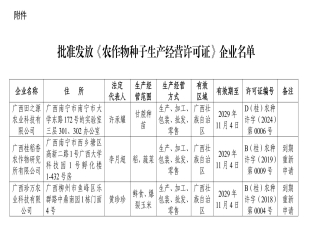 2024-11-28依据《中华人民共和国种子法》《农作物种子生产经营许可管理办法》等有关规定,批准发放广西粮发种业有限公司等5家企业《农作物种子生产经营许可证》(详见附件),现予公告。 附件:批准发放《农作...