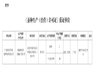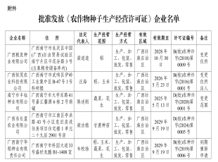 2024-11-28依据《中华人民共和国种子法》《农作物种子生产经营许可管理办法》等有关规定,批准发放广西田之源农业科技有限公司、广西桂稻香农作物研究所有限公司和广西珍万农业科技有限公司《农作物种子生产经营许可证...