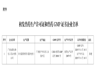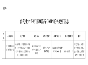 2024-11-28根据《兽药管理条例》规定,经审核,广西英路维特药物有限公司符合兽药生产许可变更条件,准予换发《兽药生产许可证》。 现予公告。 附件:兽药生产许可证和兽药GMP证书变更信息 广西壮族自...