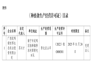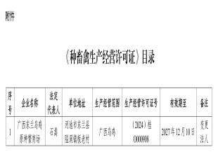 2025-10-16根据《中华人民共和国畜牧法》《种畜禽生产经营许可管理办法》(中华人民共和国农业农村部令2025年第1号)有关规定,经审核,广西东兰乌鸡原种繁育场符合种畜禽生产经营许可证(遗传资源保种场)变更法...