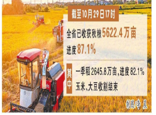 秋粮是全年粮食生产的大头,当前我省秋收秋种工作正稳步推进。记者从省农业农村厅获悉,截至10月29日17时,全省已收获秋粮面积5622.4万亩,进度87.1%,其中,一季稻2645.8万亩,进度...