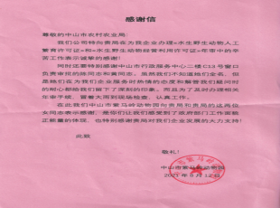 2021-09-172021年8月12日,中山市紫马岭动物园给市农业农村局审批办送来感谢信,感谢市农业农村局审批办工作人员热情周到服务,耐心解答企业有关疑问,冒着大雨现场核查,及时为企业办理水生野生动物人工繁育许...