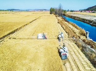 2021-09-16连日来,东港市水稻收割全面展开,一辆辆水稻收割机在金色稻田中穿梭,描绘出一幅幅唯美的秋收画卷 。图为11月1日,在东港市椅圈镇的稻田里,收割机在联合作业。 原文链接:http:/...