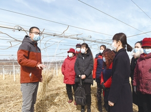2021-09-16元宝区妇联举办“乡村振兴 巾帼行动”农业科技培训,组织有自主创业意向的妇女到农业科技基地参观,并邀请农业专家现场传授新兴经济作物种植技术。图为2月26日,参加培训人员在金山镇炮守营村软枣猕猴桃...
