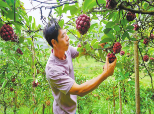 2025-10-27村民采摘血藤果。通讯员 程攀 摄 金秋时节,文山壮族苗族自治州马关县仁和镇岩脚村委会上发能村民小组的“黑老虎”种植基地里,翠绿藤蔓间,一颗颗饱满圆润、色泽紫红的“黑老虎”挂满枝藤,清甜果香随...