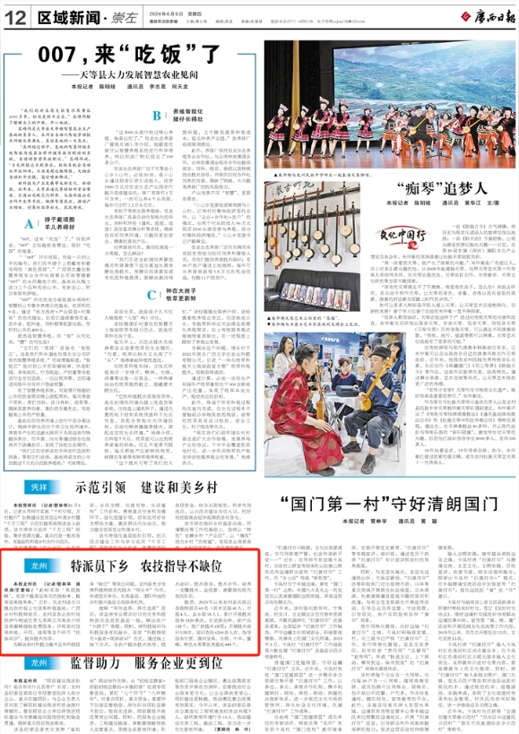 据悉,2023年以来龙州县共派出各级特派员60名(其中区级41人、市级4人、县乡级15人),累计开展技术服务1520多次,引进新品种、新产品125个,推广新技术65项;开展技术培训135次,培训农民6200余人次,指导服务甘蔗、澳洲坚果、水稻、牛羊、蜜蜂、特色水果等各类基地445个。