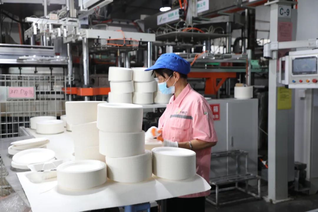 6月4日,记者走进位于龙州县工业区新旺工业园的崇左众鑫环保科技有限公司,只见智能生产线上,多组设备正在不停地运转,甘蔗榨糖产生的蔗渣,经过制浆、热压成型、切边等工序后,随着机器上下运动,一份份纸质餐具、模具快速地分离出来,再由工人进行打孔、包装,杯具、碗碟、刀叉等优质精美、质感十足的环保产品就诞生了。