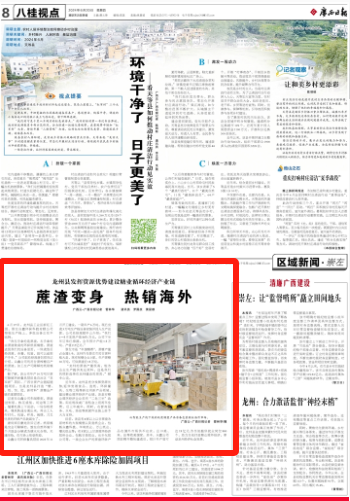 2024年6月20日《广西日报》第八版区域新闻刊登《龙州县发挥资源优势建设糖业循环经济产业链 蔗渣变身 热销海外》,全文如下: