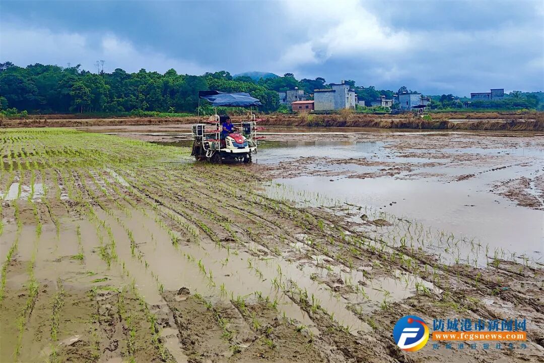那边忙收割,这边忙插秧。与此同时,在防城区那良镇其那村水稻种植基地,村民正驾驶着水稻插秧机在进行晚稻插秧作业。起步、前进、拐弯、调整速度、插秧苗……一株株嫩绿的秧苗从插秧机盘上滑落,有序地插入田地里,一行行秧苗整齐挺立,在阳光下焕发着勃勃生机。