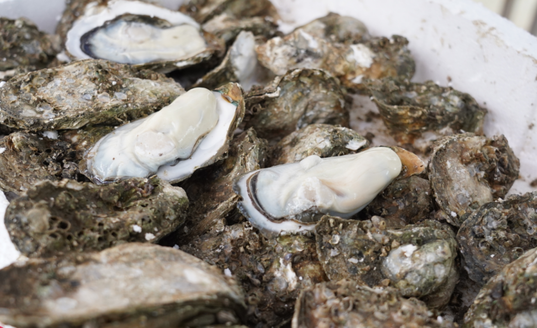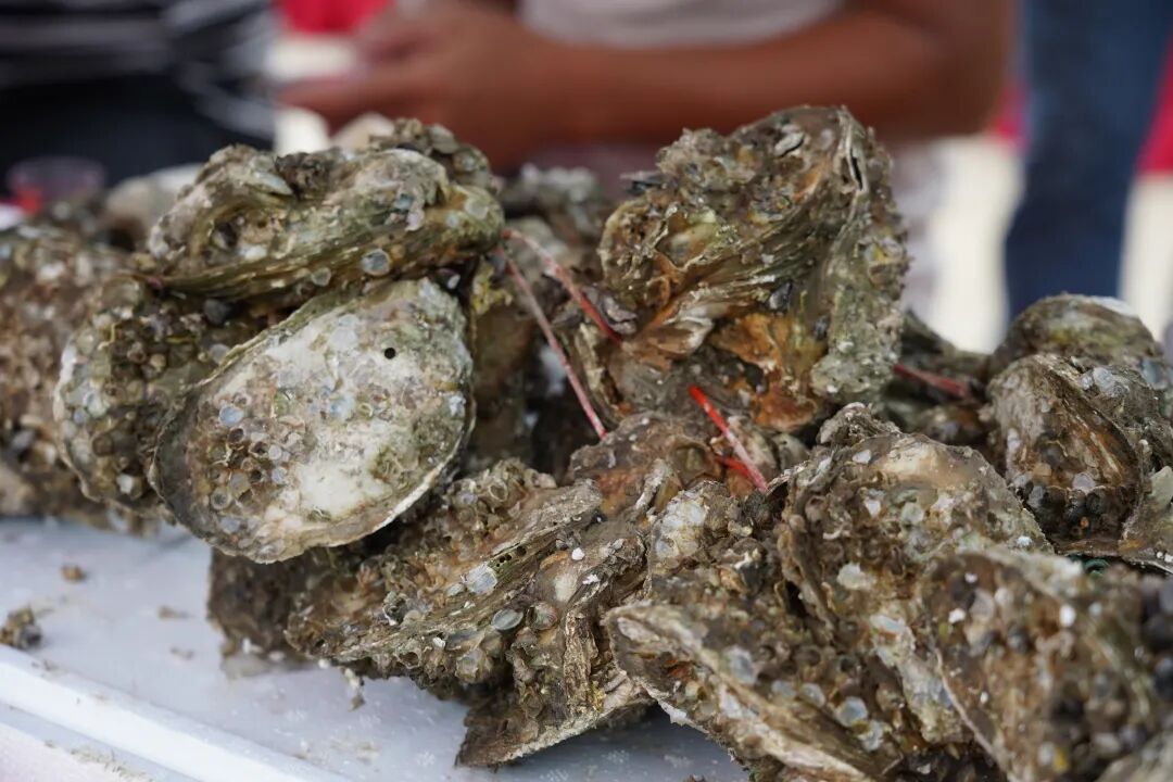 ▲特色农副产品展示会场上一串串的硕大的生蚝。