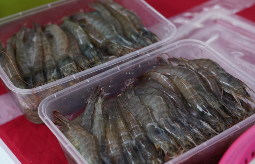 ▲特色农副产品展示会场上展示的木薯、大虾、海鸭蛋等产品。